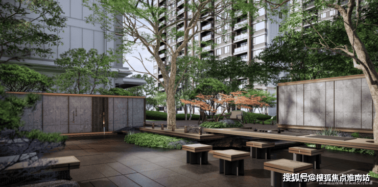 雅致石院与中庭古树相映,植物组团错落有致,营造出清逸山水园林之美,唤醒人们对林荫树下休憩闲聚的场地记忆。