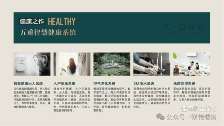 配备五重智慧健康系统,包括智慧健康出入系统、入户消杀系统、空气净化系统、3M净水系统、杀菌除湿系统