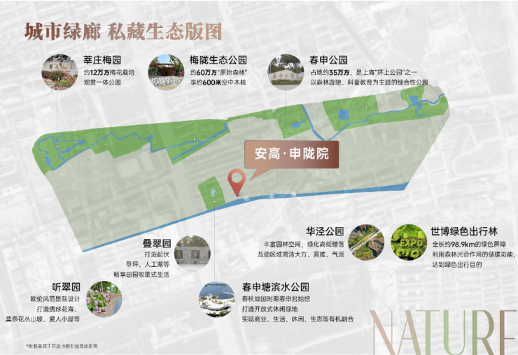 项目周边有多个生态公园,约60万方的梅陇生态公园、约35万方的春申公园、约12万方的莘庄梅园以及春申塘滨水公园等等,生态宜居属性拉满!