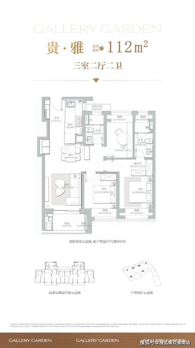 112㎡三房:采用“S墙+全飘窗”设计,得房率约75%,空间利用率高;