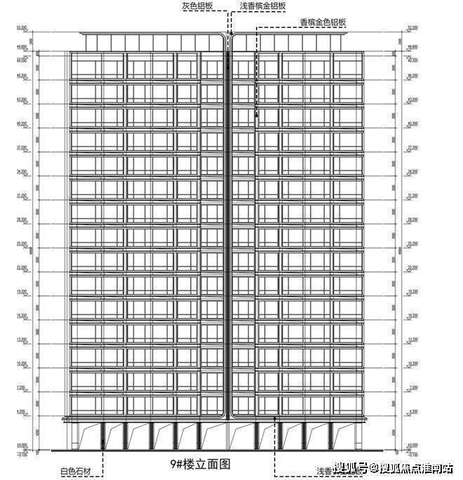 住宅基座浅香槟金铝板搭配白色石材;立面为香槟金色铝板、灰色铝板及浅香槟金铝板。