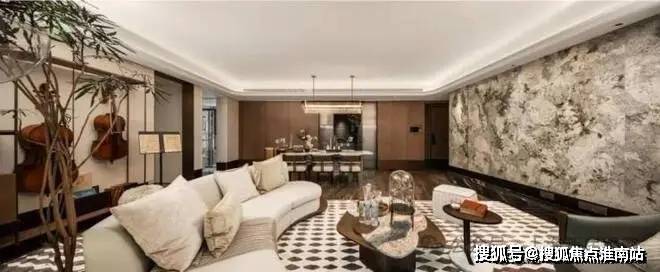 客厅以整面雪山蓝岩板打造电视背景墙,地面采用1.8米×0.9米大规格地砖密拼,营造浑然一体的奢华氛围。