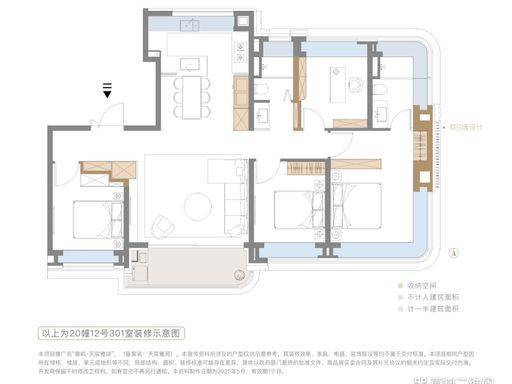 D 户型 天宸 建面约 128㎡ 四房两厅两卫:改善优选户型,四开间朝南,南北通透,客餐厅横厅设计,主卧套房带独立卫浴、衣帽间与观景飘窗,北向书房可改造为儿童房或活动室,满足三代同堂需求。