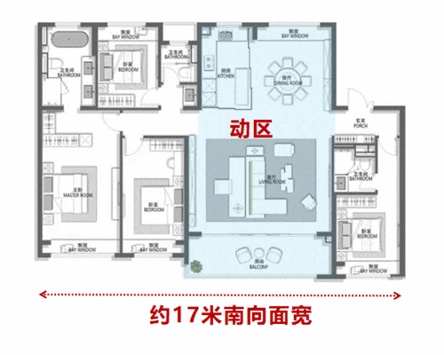约17m超大南向面宽、6.9m的大横厅、LDKB超大社交方厅,近80㎡“私人会所”,6大功能模块、可分可合的家庭居住模式、超级大卧室,主卧小家化...