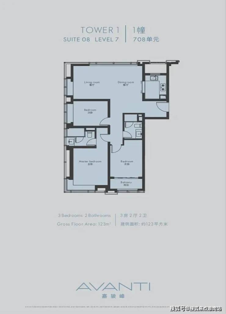 嘉骏峰建面约123㎡户型设计,以科学合理的分区规划, 打造3室2厅2卫的品质空间