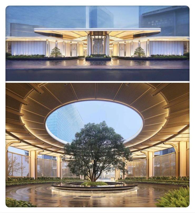 2⃣、大门 为”三重归家礼序“近60米超长景墙,辅以三重檐建筑,搭配20余米维纳灰石材景墙,迎宾罗汉松苍劲挺立于安哥拉黑光面水景之上。前院则采用‘藻井天幕’暗合天圆地方的东方宇宙观,藻井落中‘百年古桂’贵气迎门,海纳百川。