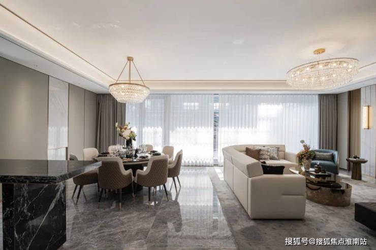 摆上一组沙发,或静坐闲读,或花园晚餐,或邀三五好友欢聚,都有一种悠然自得的安定感。 长面宽、短进深格局 来到室内, 一楼层高约3.4米、面宽约7米大横厅霸气十足,搭配大面落地窗,阳光清风肆意涌入,将室内映衬的一片明亮,毫无阴影死角。