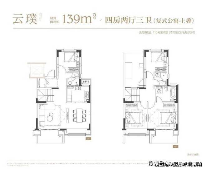 上叠户型4房2厅3卫,三层会客区,四层居住区,阳台+露台+飘窗设计,附加空间非常大,在别墅类产品中实属罕见!