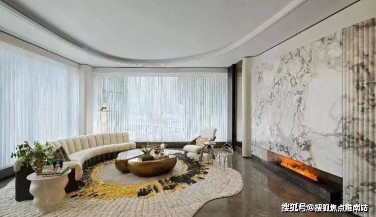潮博385m²的钻石厅,是去年的产品,沿用了梅西家同款的FENDI白大理石做了一道圆弧形背景墙,转角是工艺复杂的波浪纹,不仅造型独特,而且损耗极高,配合火红的壁炉、米白的钢琴键沙发,别致的水滴形吊顶与弧形PRADA绿奢石岛台交相呼应,升华了艺术氛围。