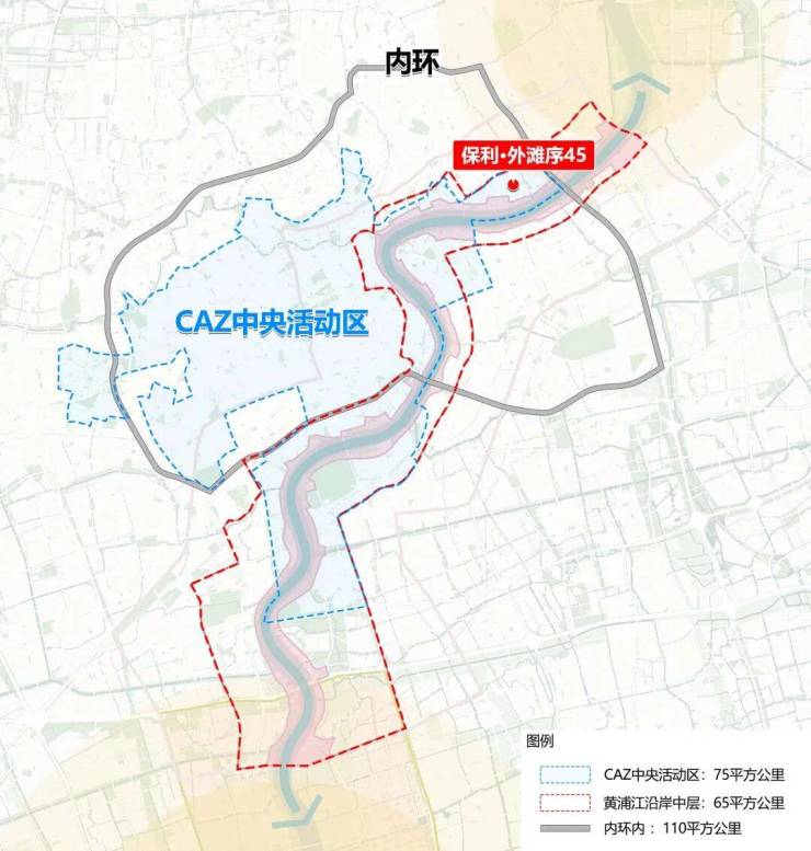【保利外滩序】BUND45,占据滨江中层范围,内环内,距离黄浦江直线距离约500米,CAZ中央活动区范围内,能级之高在黄浦江滨江带中也名列前茅。