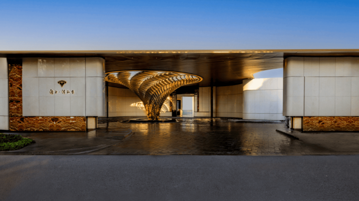 门庭延街的外立面,以精工定制弧形贝金米黄大理石为主调,镶嵌典藏级老虎玉大理石,点缀古铜色现代海派艺术感灯器,整体呈现出百年海派的贵雅气质。
