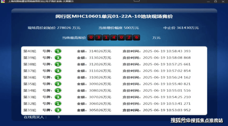 6月19日,第五批次土拍首日,保利发展以总价314026万元竞得闵行颛桥MHC10601单元01-22A-10地地块,溢价率12.95%,楼板价38775元/㎡。