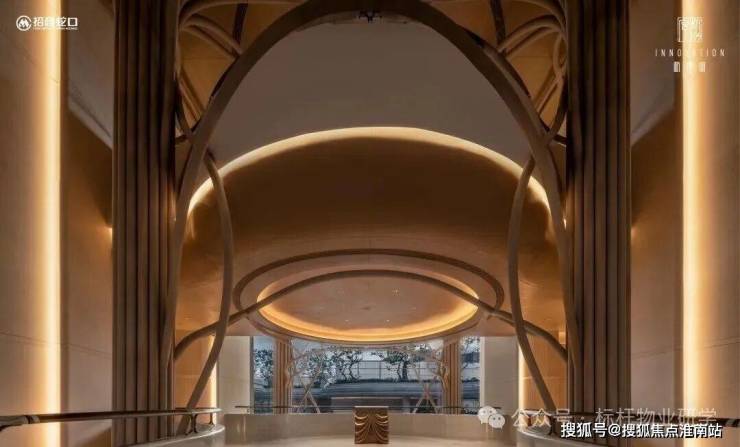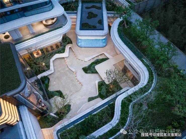 因项目整体抬高,从下沉庭院到架空层“空中花园”的落差极大,形成独特的峡谷地貌,杭序府的设计团队汲取九溪烟树为造园灵感,打造一个立体多维的城市溪谷交互园林;因项目毗邻江岸,杭序府的外立面以“站立的江潮”为灵感,大面积弧形玻璃与四层堆叠的石材线条,将钱塘江潮的千钧之力和流水之韵凝练于建筑肌理之中。