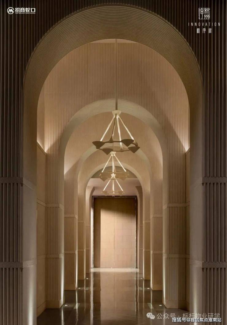 大门内外两重门厅景墙运用月光米黄石材近1000 方,搭配香槟金金属线条,汲取爱马仕全球旗舰店的双曲面叠墙造景手法,增加景墙奢华质感。