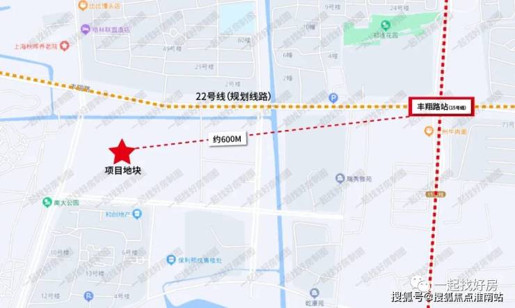 上海2023年二批次土拍第一轮中,金茂以10%的溢价率触顶摇号成交大场镇W12-1301单元35-03地块,房地联动价6.7万/m²,仅仅相隔3个月,同板块的两幅地块房地联动价就上涨了4000元/m²,而且,相比金茂地块,保利海上臻悦距离15号线丰翔路站更近(看下图)。