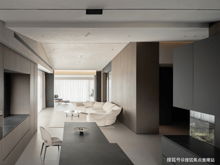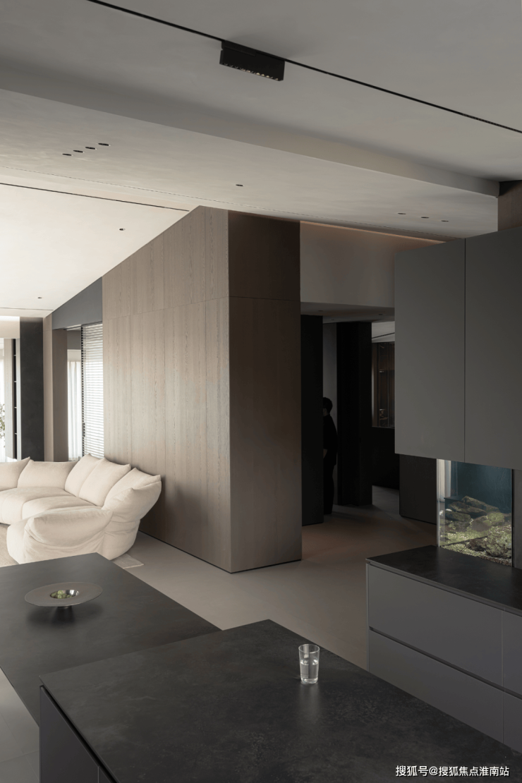 屋主为他和父母一起养了五六年的鱼儿们准备了新家,这在设计之初就需要考虑到位,除了1.6米长的超大尺寸,还有许多设备需要安放。把鱼缸规划在了一体式西厨餐边柜的区域,利用转角来连接走廊与餐厅两个功能区。