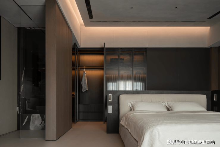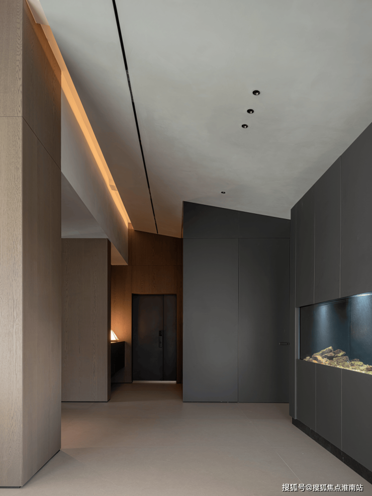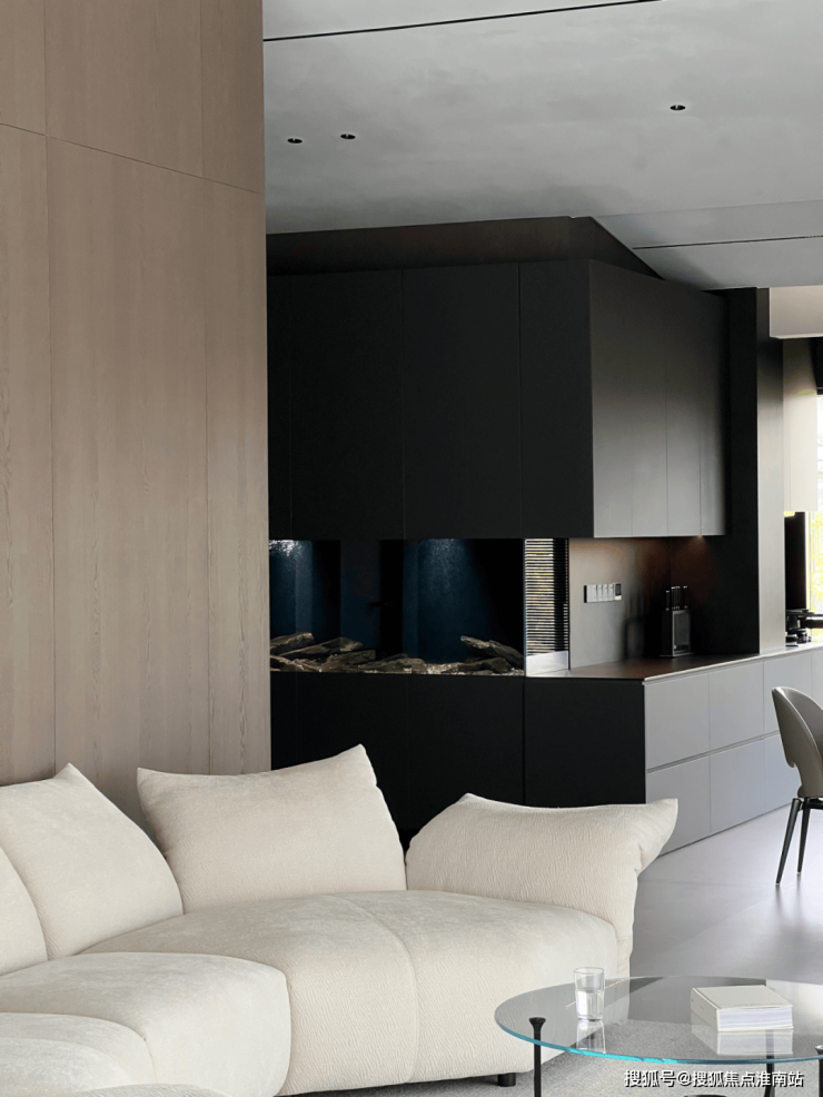 鱼缸的设备隐藏在柜子里,鱼缸暗黑系的造景与黑色柜体动静交融,成了整个空间的亮点,不仅增添了一份生机,还营造出一种宁静而浪漫的氛围。