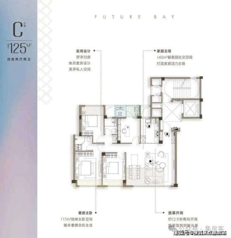 餐客厅开间6米,面积达到约60方,媲美200方大平层居住体验,主卧采用270度飘窗设计,可更好的提升主卧采光及景观。
