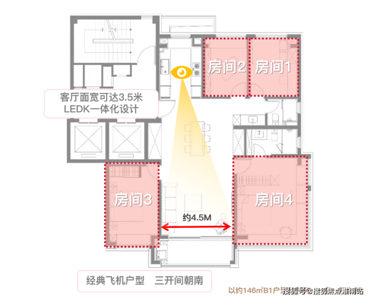 经典飞机户型,南向卧室由客厅进行分割,有效保障了多代居住的私密性,互不干扰。