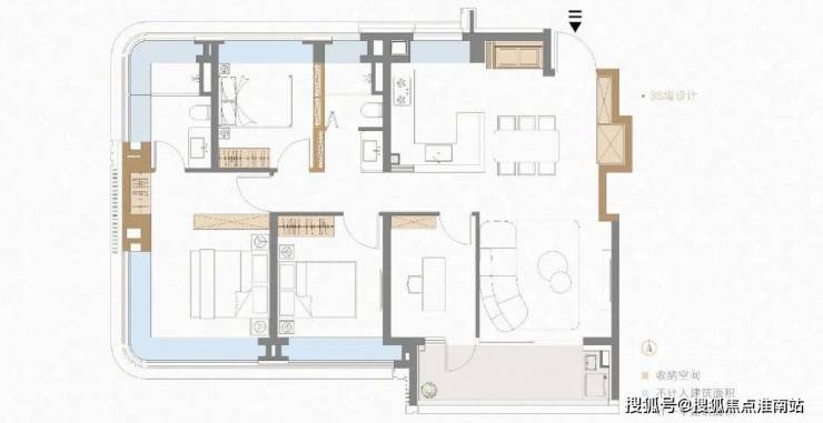 这个户型有 独立电梯入户,保障私密性的同时,还多了一个独立都电梯厅, 相当于多了一个小厅,可以用来规划摆放收纳柜,变相提高了“得房率”。
