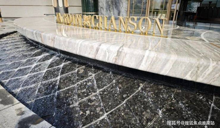 大门口的水景采用了龙鳞水纹的造型。在现场,会有种身处顶奢酒店入户大堂的观感。