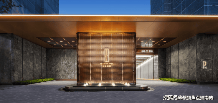 地上大堂,单元门厅的雨棚采用香槟金的弧面铝板、立面干挂爱马仕灰蜂窝岩板,岩板上嵌入专属楼栋号,单元门两侧的弧线段金属采用定制模具加工。大华星曜售楼处电话:400-9659-259✔✔✔(已认证)