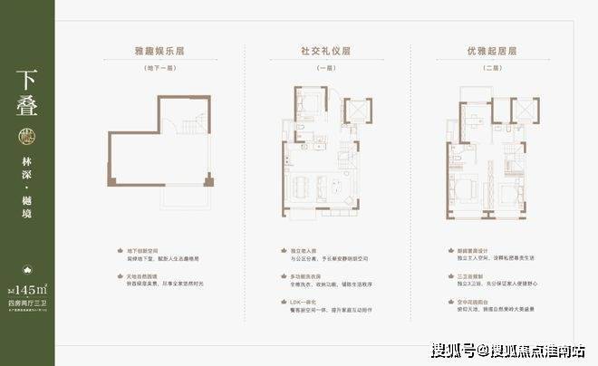 叠墅产品分为4F、6F层叠加, 主力产品建面约约122-133㎡上叠,132㎡大平层,131-145㎡下叠。
