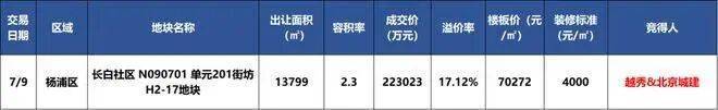 2024年7月9日,上海第三批次土拍中,北京城建与越秀地产组成的联合体以高达22.3亿元的价格成功竞得杨浦长白社区N090701单元201街坊H2-17地块(即领翠滨江),其成交的楼面价格定格在70272元/平方米,溢价率约17.12%,装修标准不低于4000元/㎡。