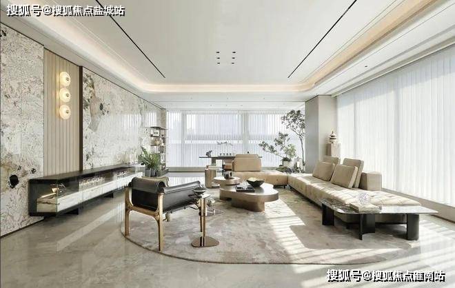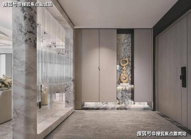 东区建面约320户型,将艺术感进一步融入日常中。特别设计的专属门厅空间,是从电梯厅延伸到家,如同一处艺廊,放慢人的情绪;室内选用了浅金色奢石(外界也称其为“芬迪白大理石”)作为主要的石材,曲面的木饰面也为浅色,整体给人以明亮感。