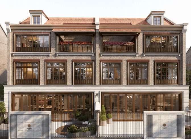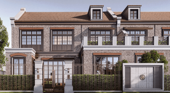 海派风貌建筑:复刻思南公馆卵石立面,采用复古红砖+石材+古铜金属线条,老虎窗设计,彰显历史文脉