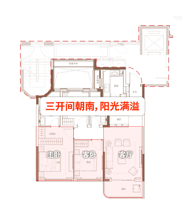 三开间朝南,南向面宽达约10米,阳光充足;餐客厅与阳台形成流畅动线,社交空间舒适开阔;弧形阳台放大景观视野;主卧预留独立衣柜空间,卫生间罕见南向采光,舒适度拉满。