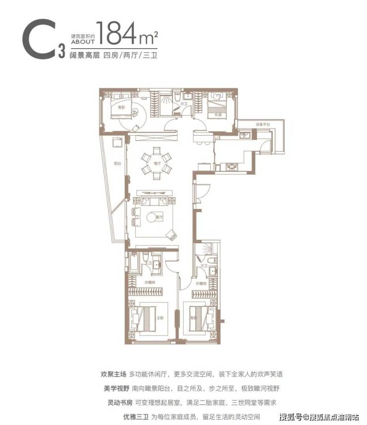 餐客厅阳台一线贯通,动线流畅,弧形阳台拓展景观视野。