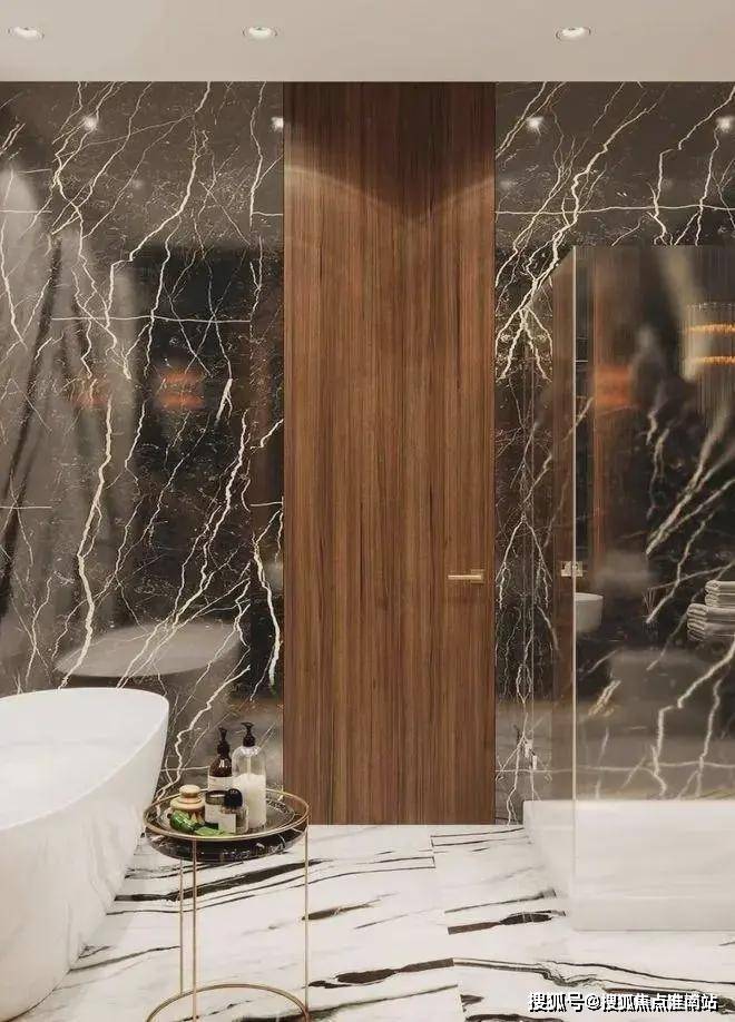 在STUDIA54的设计项目中,浴室特别引人注意.这个项目也不例外,双人洗手台,Eichholtz的灯和“Panda”的大理石,在逻辑上延续了公寓的主题.
