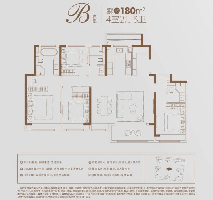五开间朝南的全明通透,四房两厅三卫,双主卧设计,舒适起居大享不同,使得其居住感相当阔绰,为生活增添更多情景体验。在精巧铺排上,LDKB客餐厅一体化设计,大尺度横厅尽享阔景生活;动线合理的基础之上,户型格局方正,赋予生活幸福美感。