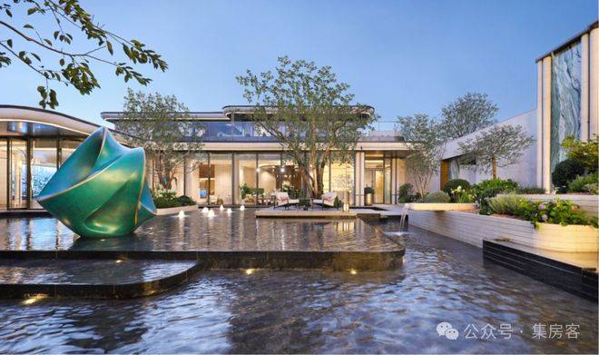 社区主入口是超宽幅门头,宽约 80m 高约 7.1m,两侧的维多利亚绿奢石以及中央的白雪公主透光石很吸睛,浅色的部分则是贝金米黄石材,圆弧的工艺处理也更显温润及价值感,中央栽植的超大紫薇树拥有约60年树龄,底部则是采用宝格丽黑奢石作为基座