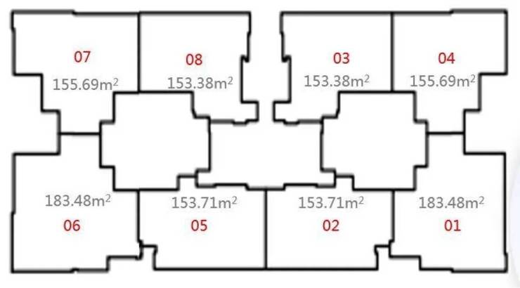 该栋分为A/B单元,每个单元有四个单位:包含3套153㎡及1套183㎡,平面布局与住宅相似。