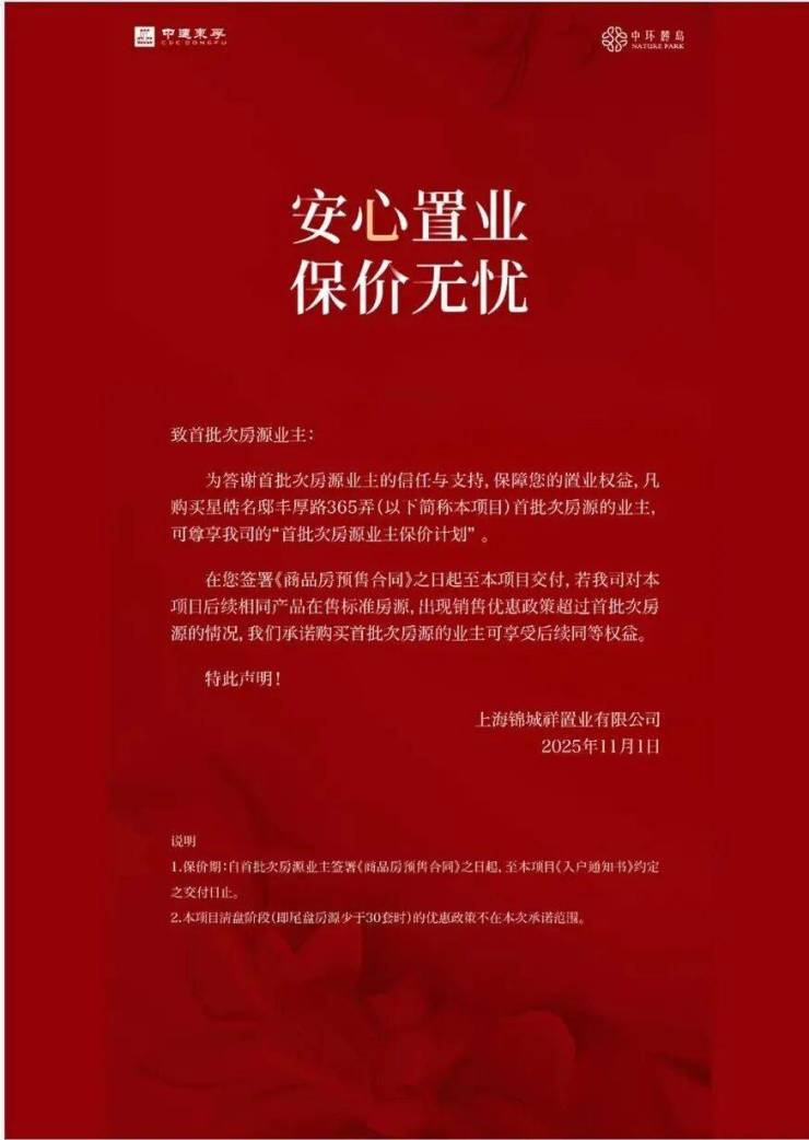 上海第二个作出“保价”承诺的项目,11月1日,中环麓岛项目也发布了公告:凡购买首批次房源的业主,可享“首批次房源业主保价计划”:
