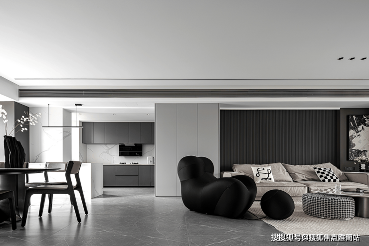 设计中贯穿的开放式布局,抛却了传统封闭的束缚,使各功能区自然而然地相互融合。黑色的异形沙发如一曲动感的旋律,注入了空间活力,其多处凸起的设计,更是贴合身体曲线,为居者带来舒适无比的体验。
