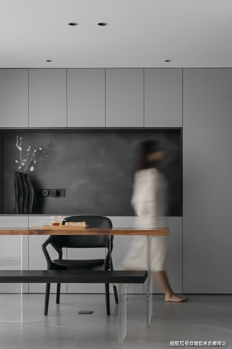 The fusion of the dining room and the kitchen presents a harmonious atmosphere, with built-in lockers and open kitchen design, making the whole space smooth and natural, spacious and bright. During the meal, through the French window, indulge in the beautiful scenery outside the window, as if it is a kind of enjoyment of dialogue with nature.