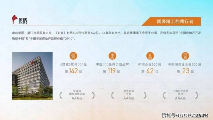 象屿地产|国匠精工的践行者象屿集团,厦门市属国有企业,《财富》世界500强位居第142位。31载象屿地产,象屿集团旗下全资子公司,深耕长三角核心都市圈,享誉华东区域的精品住宅开发商,连续多年获评“中国房地产开发稳健十强”和“中国华东房地产品牌价值TOP10”。象屿地产位列2024年上半年全国销售金额第30位(操盘)、上海市场销售金额位列第17位(操盘)、苏州市场销售金额位列第一。