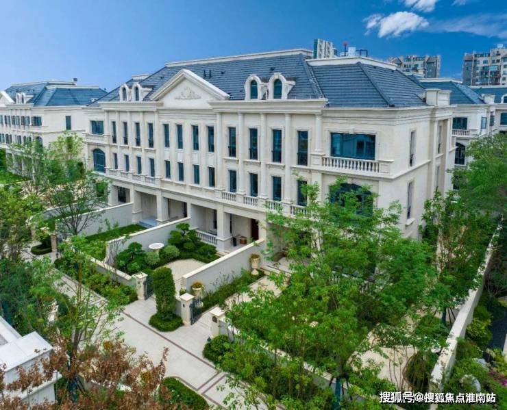 整个园区,以经典的绿城法式墅区景观大中轴贯穿,占地约1000多㎡,联排建筑的设计,融合了中国传统院落布局与法国枫丹白露宫的审美,外立面大面积采用全石材干挂,檐口等细节部位使用仿石。