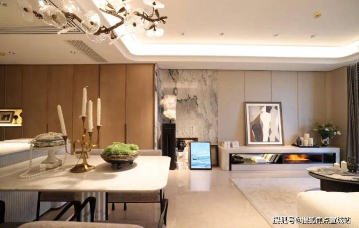 再来看看134㎡3室2厅2卫样板房。比起112㎡户型,这个客厅要宽敞很多,岛台也可以做成独立样式,摆放6人长桌也绰绰有余。主卧采用270度拐角飘窗设计,采光面拉满。