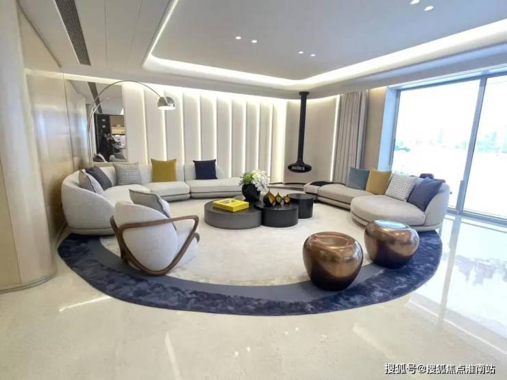 客厅空间采用大量造价昂贵的弧面设计,带来更有格调的审美价值: