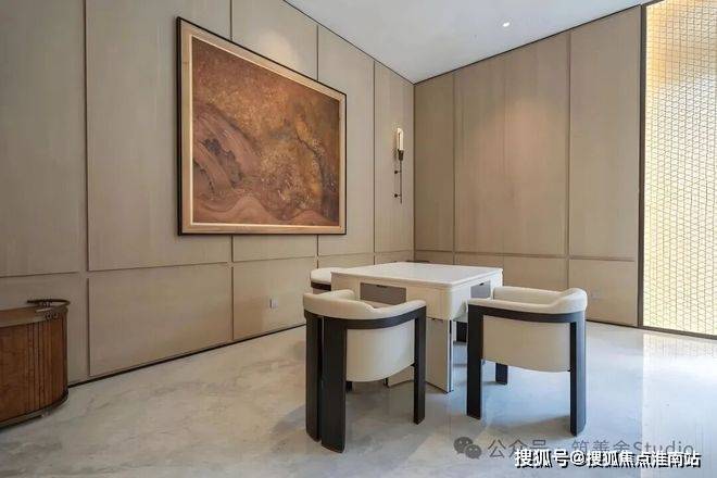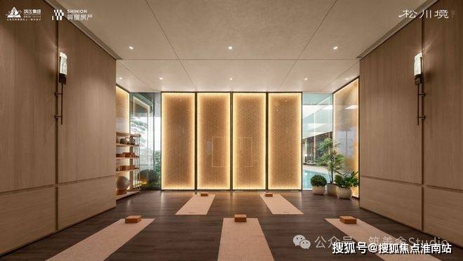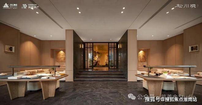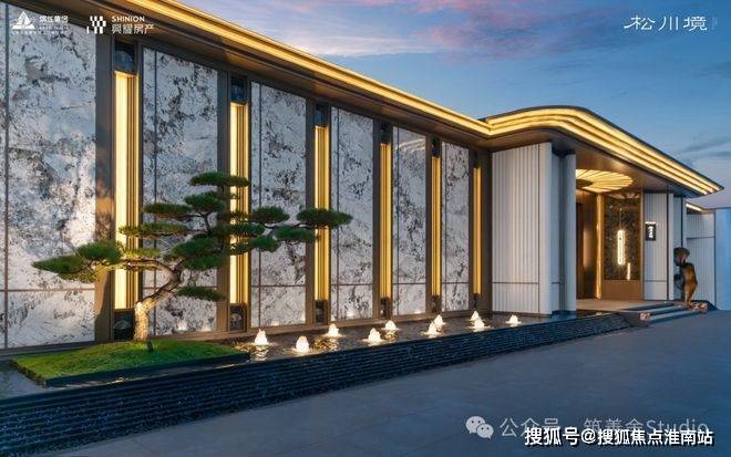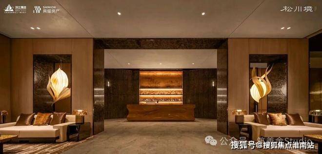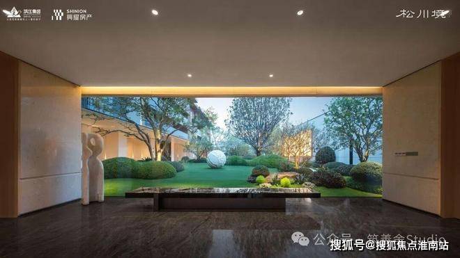 大门徐徐开启,步入序厅,眼前豁然展现《松阁观潮图》所蕴含的“动静相依”东方美学意境。定制套石的龙粼照壁在波光粼粼中熠熠生辉,构筑起松川境独有的文化印记与精神象征。松之静谧与潮之壮阔在此完美融合,每一步都隔绝了门外的喧嚣,实现了从纷繁世界到宁静家园的优雅过渡。