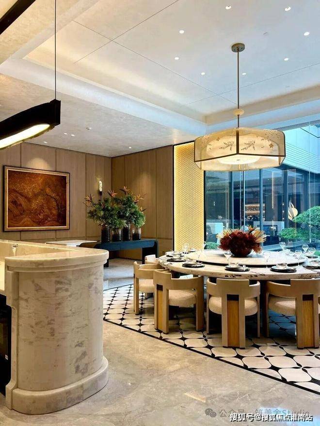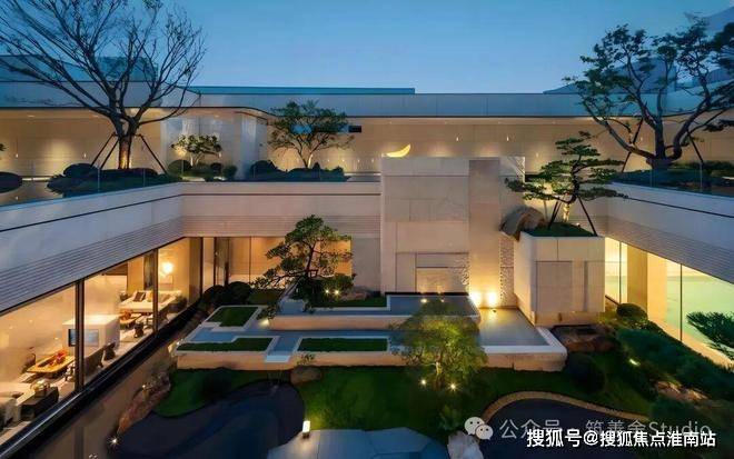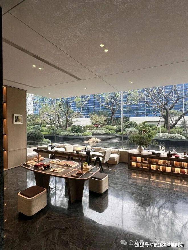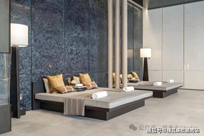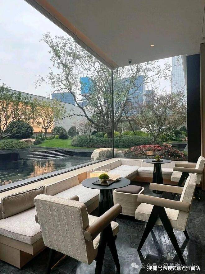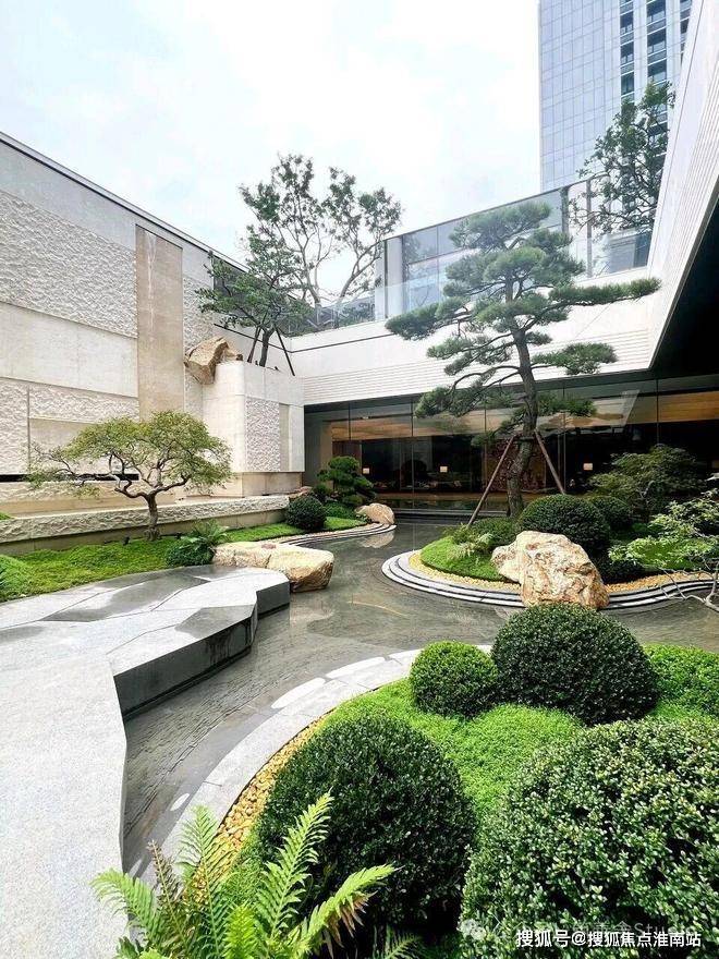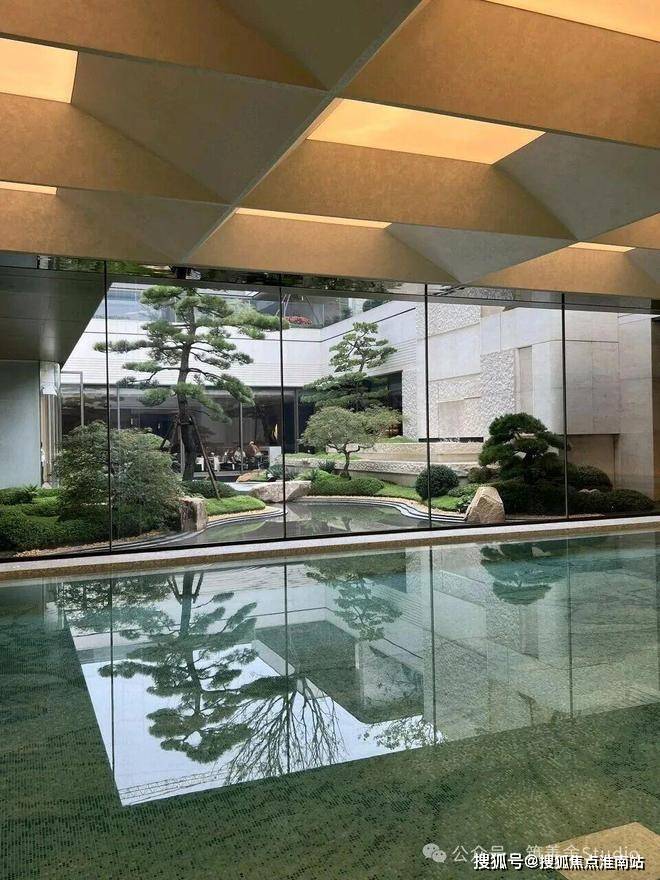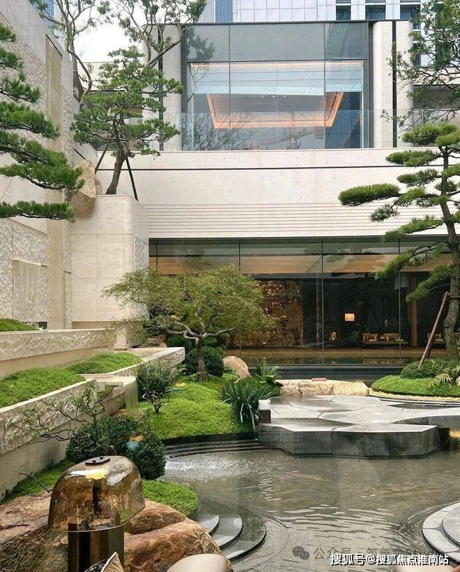 会所庭院以建筑为框,引泉植松,奢造约7米高溪山流瀑,特选6棵造型黑松。将二维的《溪山行旅图》转译为一幅“幽深与静谧、壮丽与宁静”的立体山水画卷。