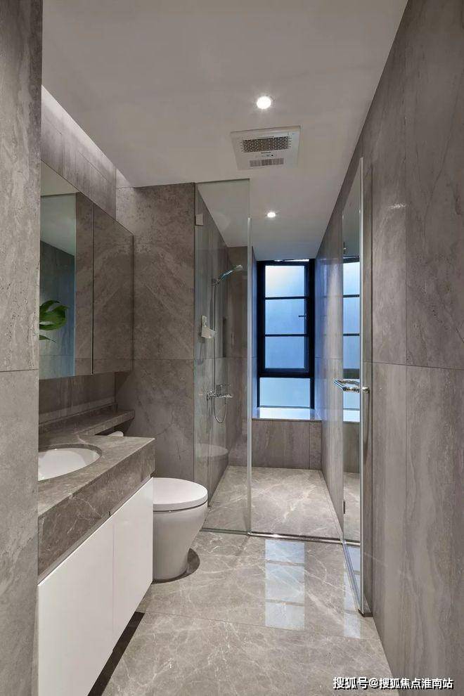 公卫的洗手间色彩和两个套间的洗手台一致,马桶后面的镜柜做了整体的收纳,墙面1.2米的大瓷砖竖向的铺贴,两块到顶,显得很整体也很有气势。