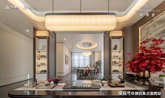 时舟里开发商预约热线:400-8567-334✔✔杭州时舟里官方售楼处电话☎:400-8567-334✔✔✔)开放式的客餐厅设计,吊顶侧边一些细节的处理与柜子的钢条和大理石的分缝有一些联系,整体立面的横向缝隙的高度都有一些相应的联系,让空间的感受更为整体并且相互之间有一些联系。