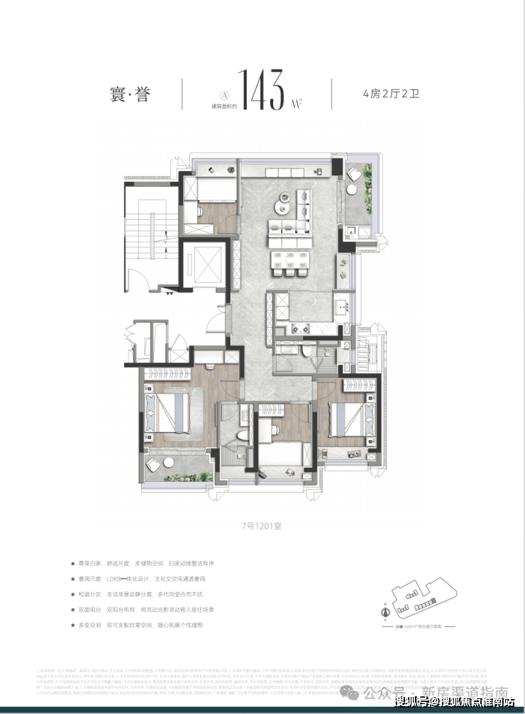 洄游式270°采光大横厅亮点满满,北向飘窗可升级为全落地窗,搭配东面270°景观阳台,形成环幕通透格局,将苏州河景与社区绿意尽收眼底,这一“端厅式设计”在约143㎡面积段实属罕见;三卧室朝南的“平权采光”设计,则精准匹配了二胎或三代同堂家庭需求。