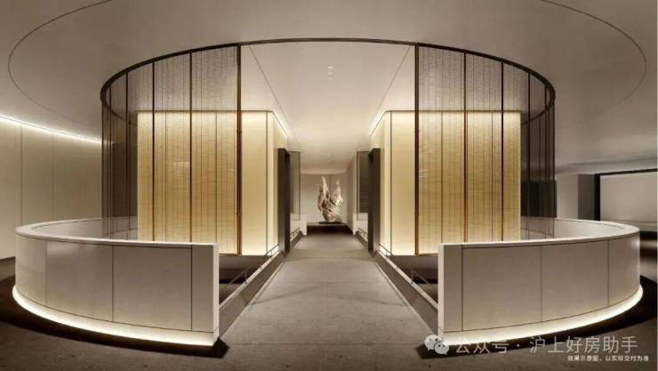 比起中规中矩的直线,弧形施工工艺更复杂、造价更高,却多了几分灵动轻盈!这种弧形的元素不只是在样板间里,在售楼处也能经常看到,比如电梯厅。