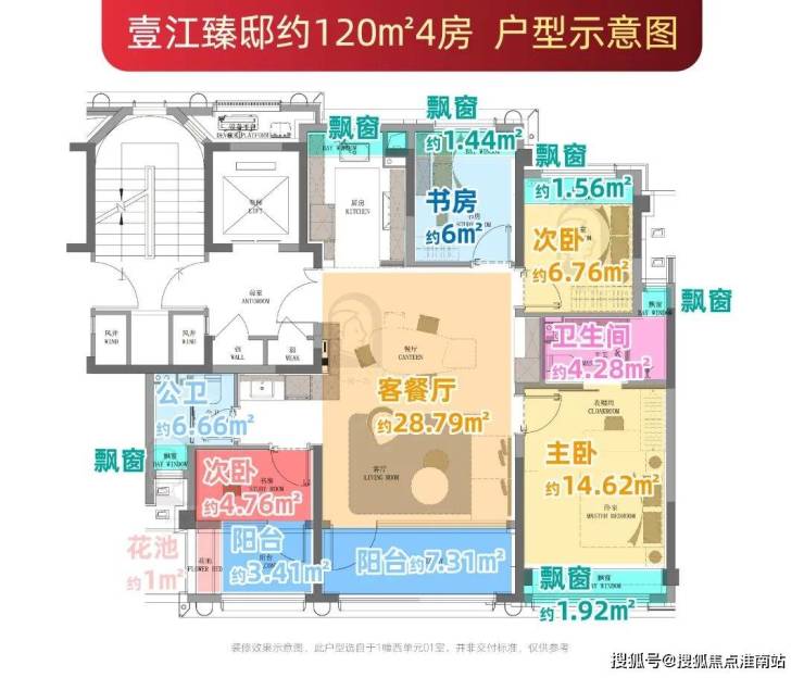 建面约120㎡户型通过6个飘窗、2个南向阳台(赠送一半面积)及独享约5㎡电梯厅,整体赠送面积约18.5㎡;